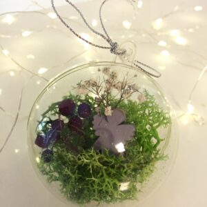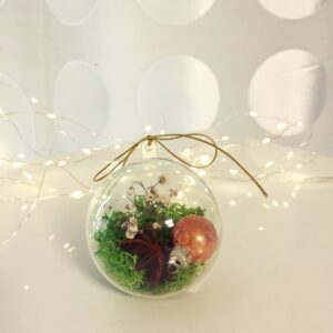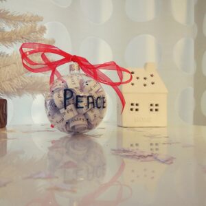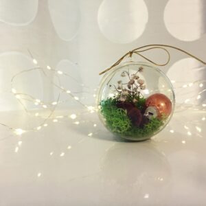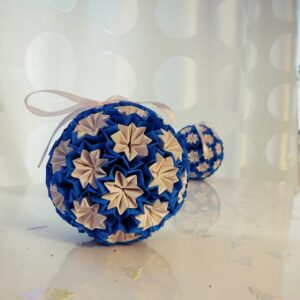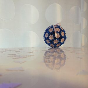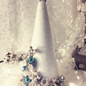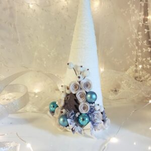 Bradut de Craciun cu dantela, flori din hartie si globuri turcoaz